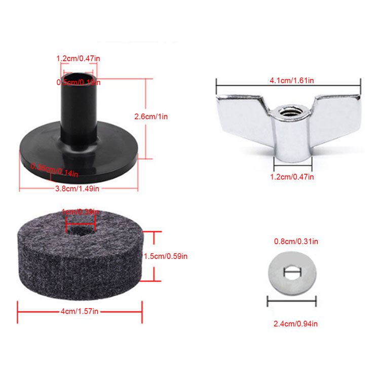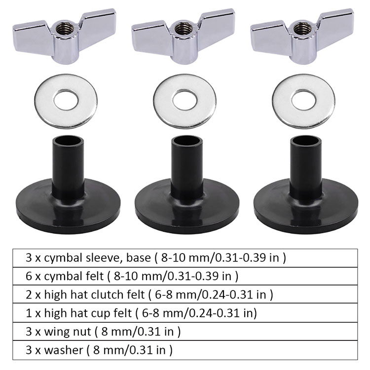 3 、 Product afmetingen: 3 x cimbaal mouw, base (8-10mm), 6 x cimbaal vilt (8-10mm), 2 x hoge hoed clutch vilt (6-8mm), 1 x hoge hoed cup vilt (6-8mm), 3 x wing moer (8mm) en 3 x washer (8mm)