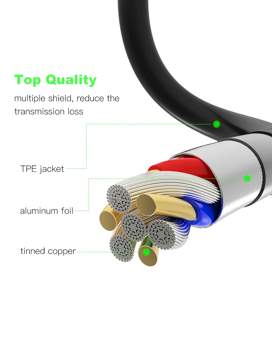 Outer shield:95% koperen vlechtschild, voorkomt meest lage frenquency geluiden en interferentie.