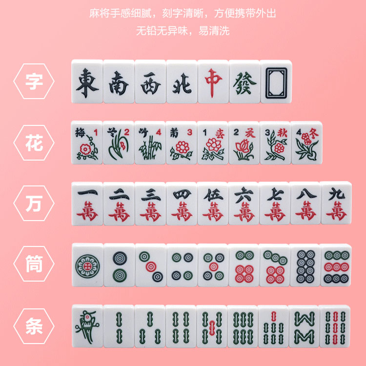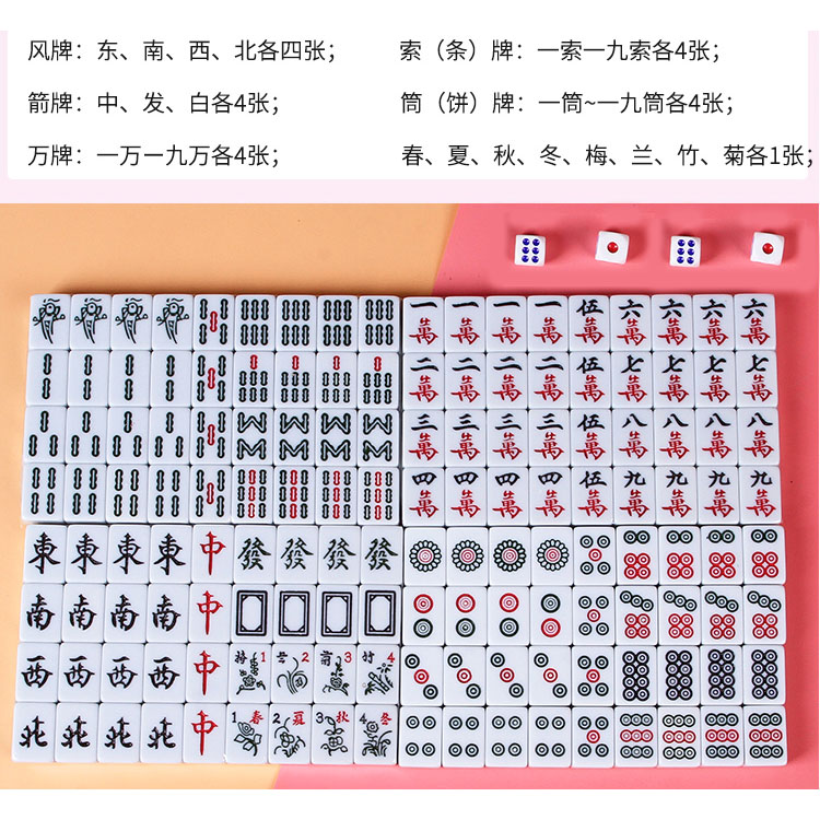 -144 tegels omvatten 36 cirkels, 36 bamboos, 36 tekens, 12 draken (rood, groen, wit), 16 winden (noord, oost, spouth, west), 8 bloemen en seizoenen