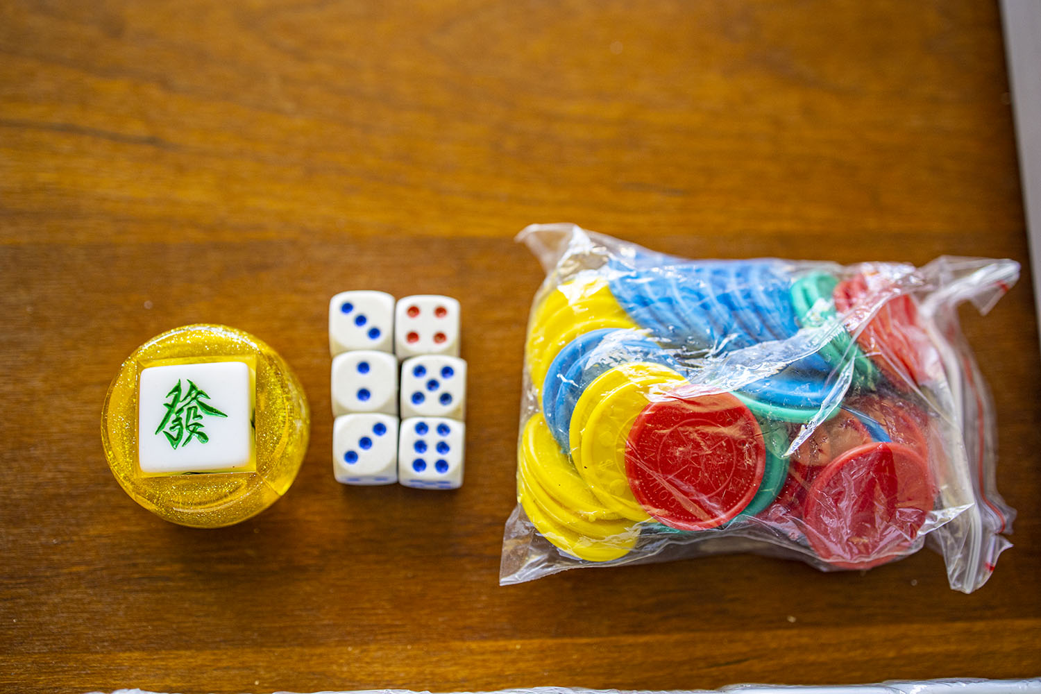 -144 tegels omvatten 36 cirkels, 36 bamboos, 36 tekens, 12 draken (rood, groen, wit), 16 winden (noord, oost, spouth, west), 8 bloemen en seizoenen