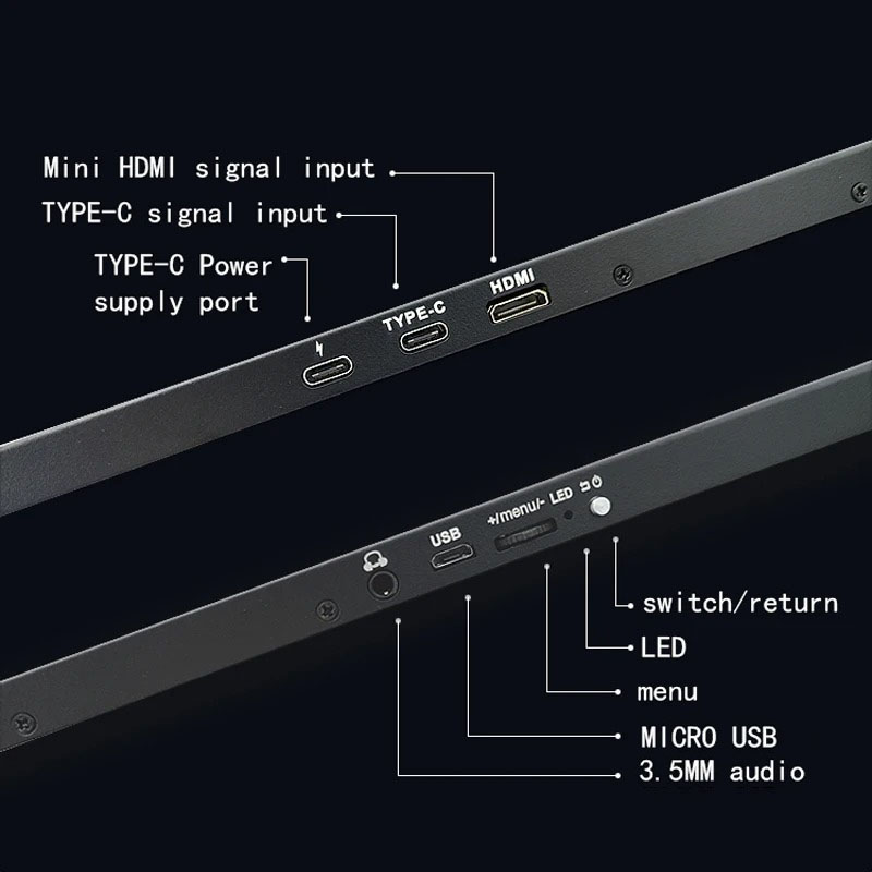 Multi-interface: type-c input 1/ type-c input 2/koptelefoonaansluiting/mini HDMI/type-c OTG