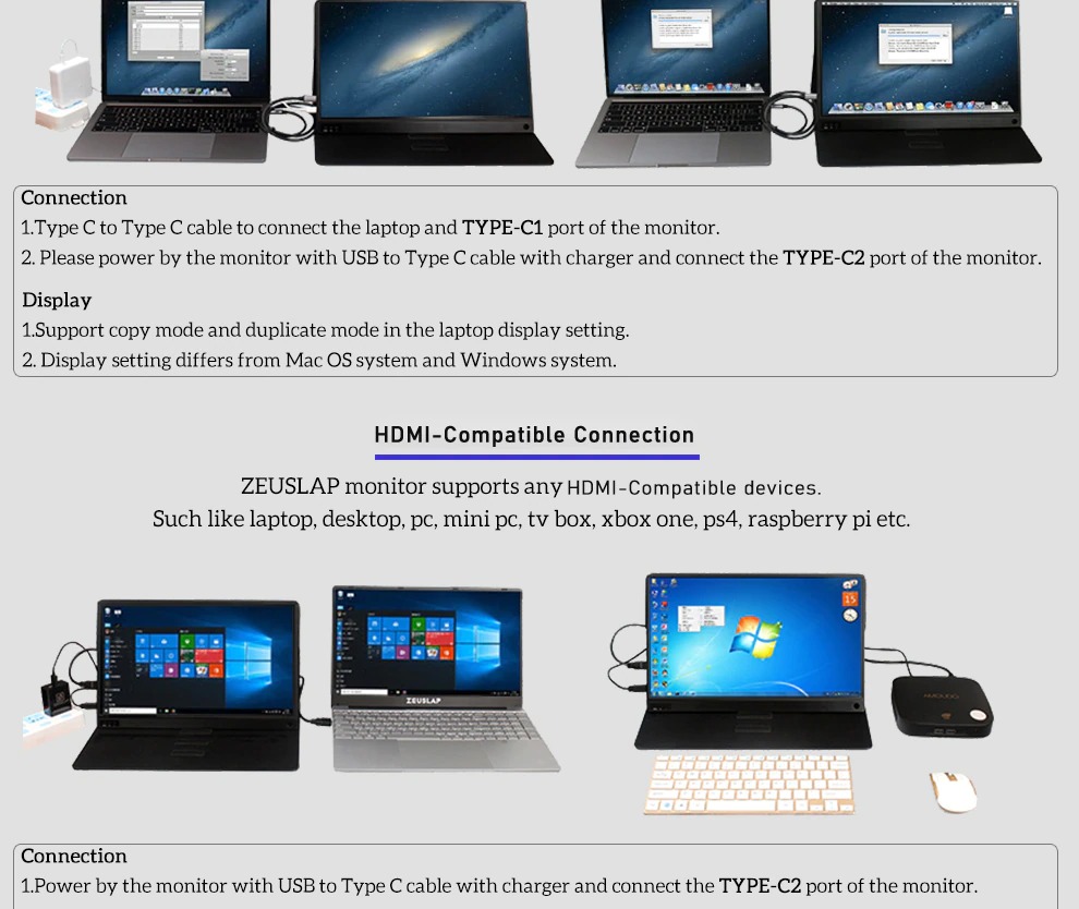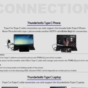 Er zijn geen stuurprogramma’s nodig: Exclusieve dual type-c full features poorten-Een ture plug and play usb draagbare monitor kan worden aangesloten met een enkele USB C 3.0-kabel (volledige functies ondersteunen, kom in de doos), het bespaart zeker uw tijd en verhoogt uw efficiëntie. U kunt het ook op uw apparaat aansluiten via een HDMI-kabel met een stroomkabel, ze zitten ook in het pakket. Er zijn geen stuurprogramma’s nodig