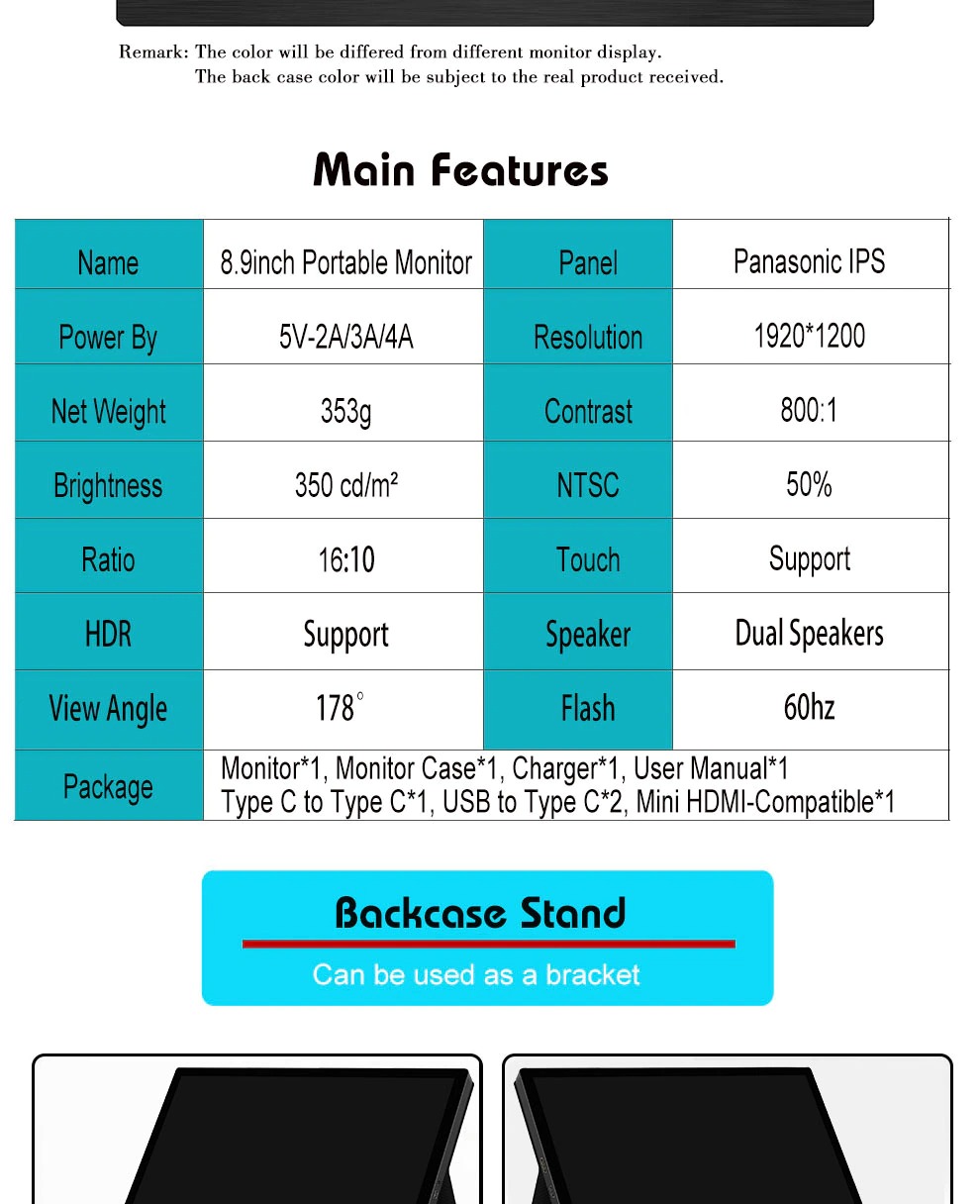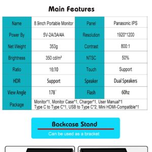 8.9 “Touch Monitor 1920*1200P Hdr Ips Scherm Draagbare Monitor Voor PS4, Switch, Xbox, pc, Samsung 9S,Huawei P30,Macbook Pro