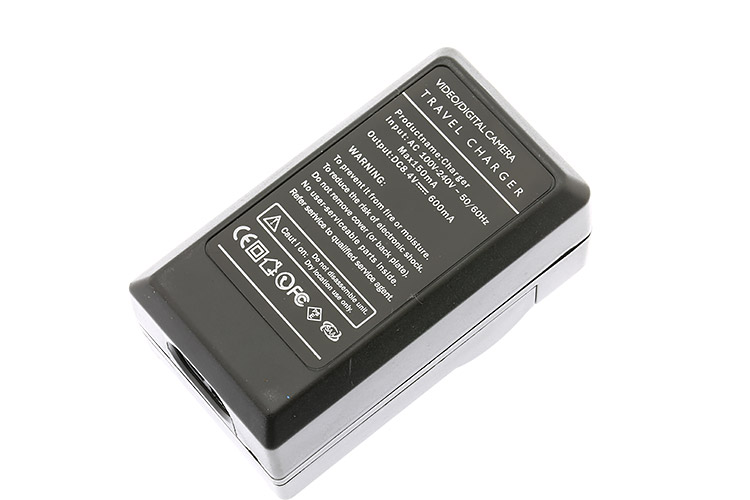 Oplader gemaakt voor Sony BC-VM10. Een rood indicatielampje geeft aan dat de accu wordt opgeladen, een groen lampje dat de accu volledig opgeladen is.
