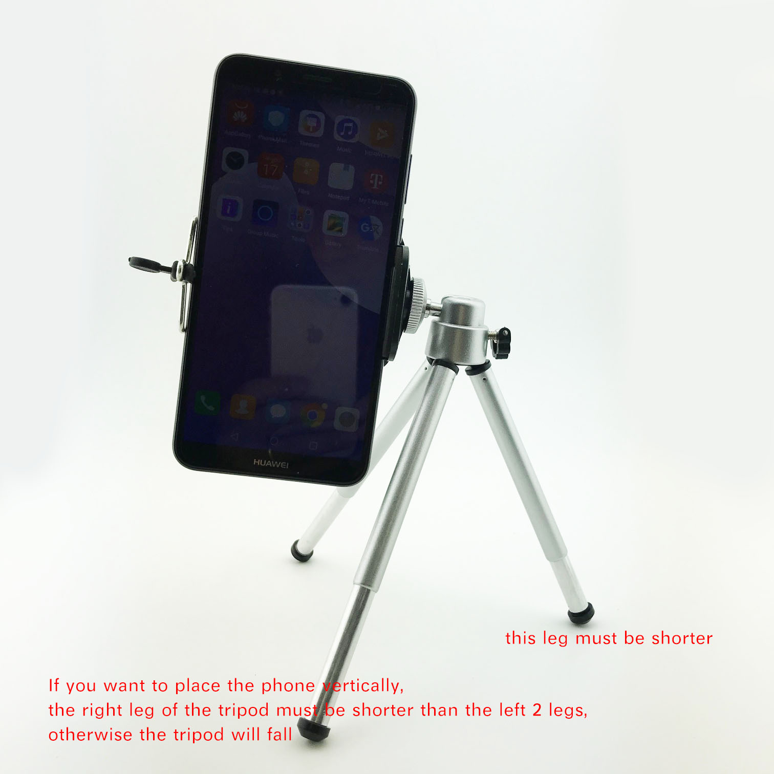 Letop: Als u de telefoon verticaal wilt plaatsen, moet het rechterbeen van het statief korter zijn dan het linkerbeen, anders valt het statief. De mobiele telefoon kan alleen bijna 90 graden verticaal worden geplaatst, hij kan niet volledig 90 graden verticaal worden geplaatst, zie foto