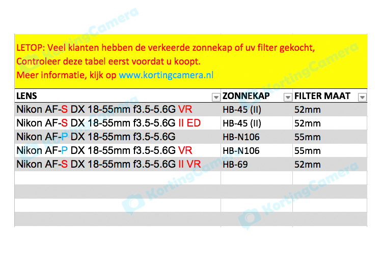 LETOP: Nikon heeft veel models van 18-55mm lens, en deze zonnekap is geschikt alleen voor de volgende Nikon objectieven (met AF-S en ED):