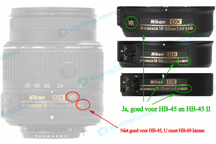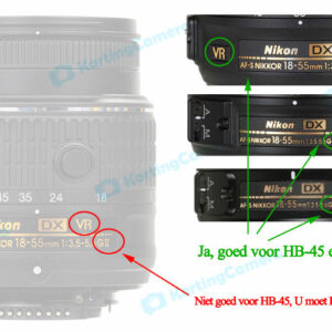 LETOP: Nikon heeft veel models van 18-55mm lens, en deze zonnekap is geschikt alleen voor de volgende Nikon objectieven (met AF-S en ED):